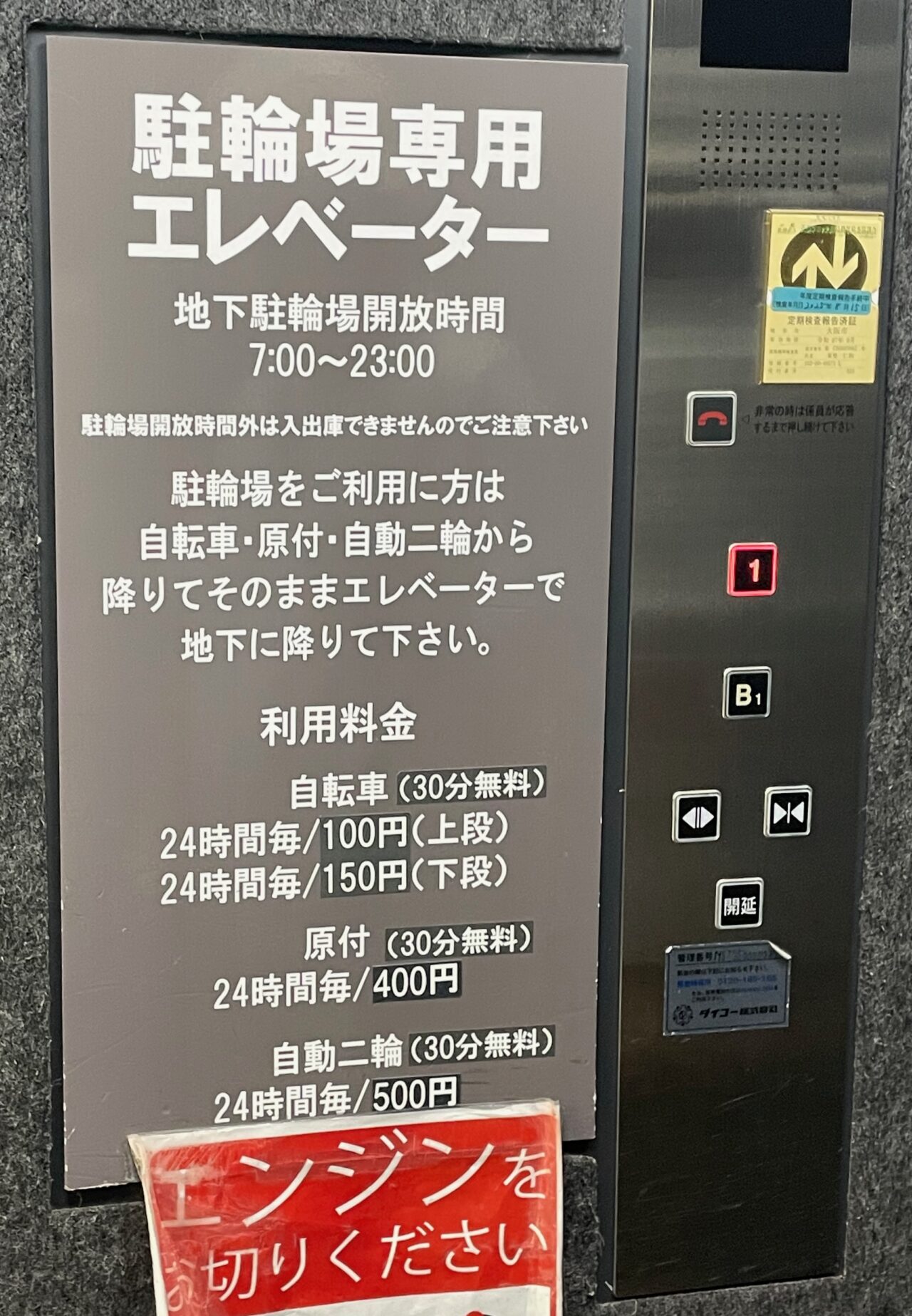 30分の無料時間もあって値段も良心的ですが、人気があって夕方や土日は満車になることが多いです。まずはココをチェックして空いてなければ向かいの地下駐輪場へ。