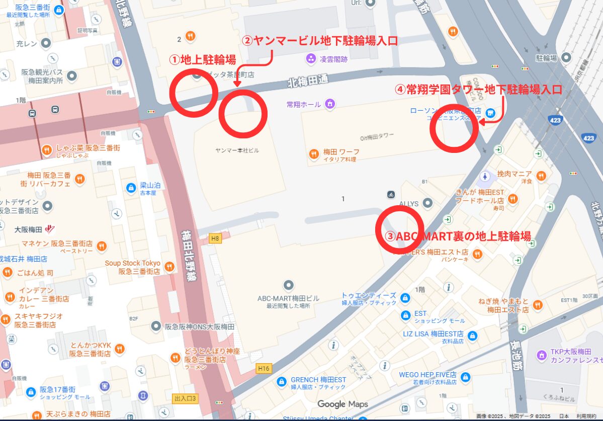 【うめだ茶屋町南の駐輪場4選|30分無料・入口地図あり】阪急三番街、エスト、H&M、阪急電車の利用に便利